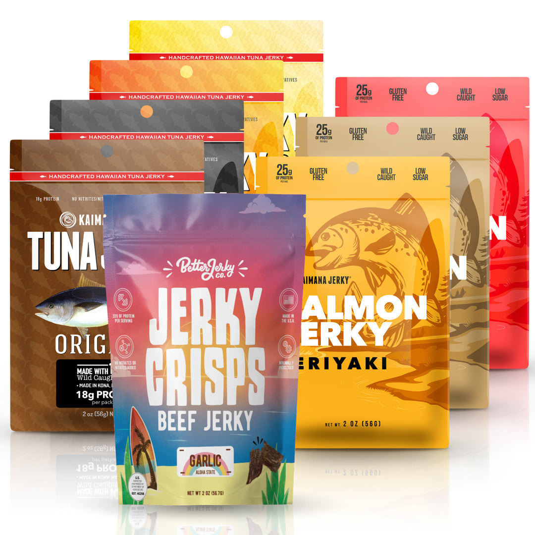 Ahi Tuna Jerky | Wahoo Fish Jerky | Beef Jerky | Fish Jerky | Dried Squid | Pork Jerky | Dried Seafood Snacks | Dried Fish | Sugar-Free Jerky | Jerky Sampler Packs